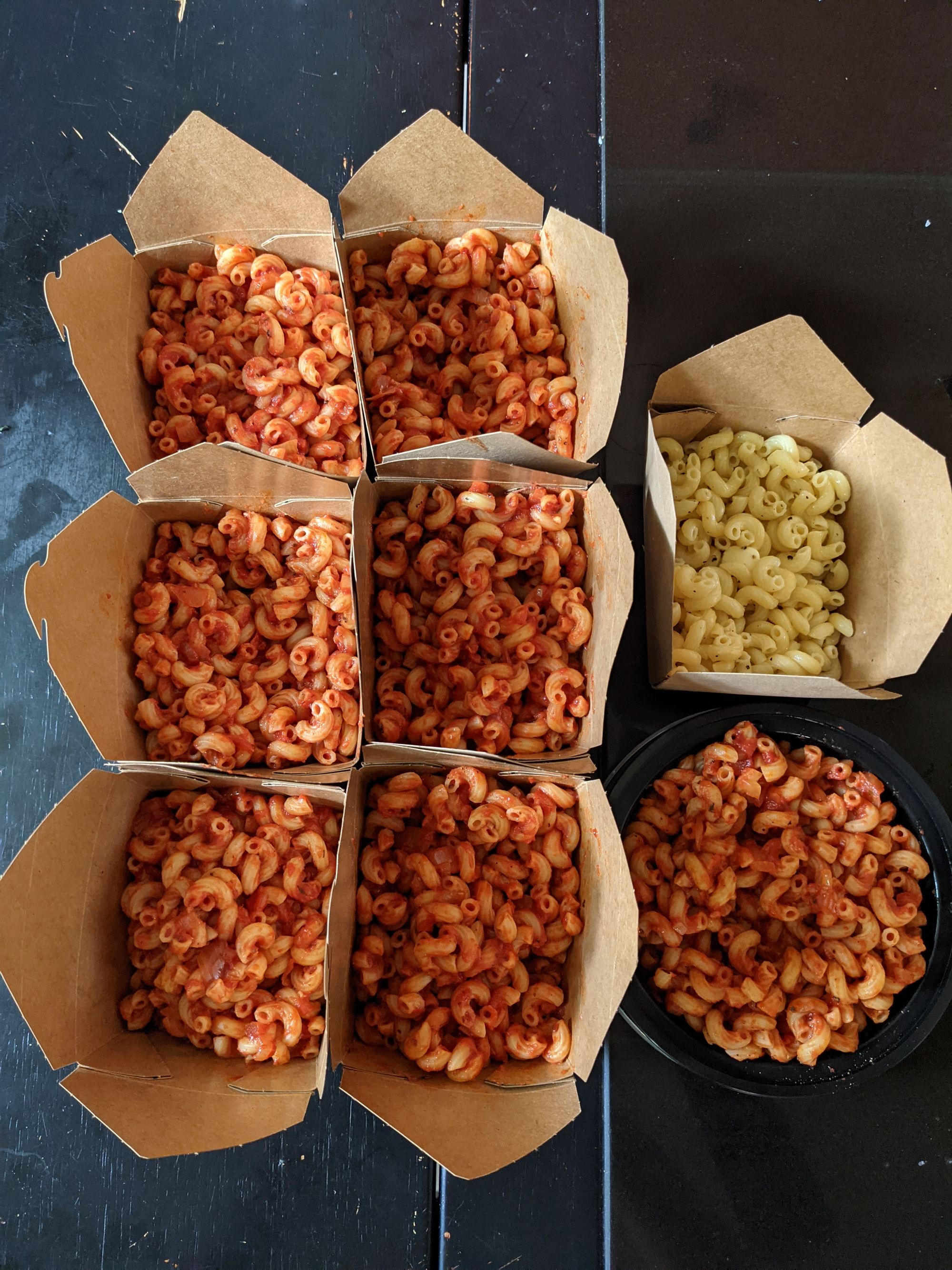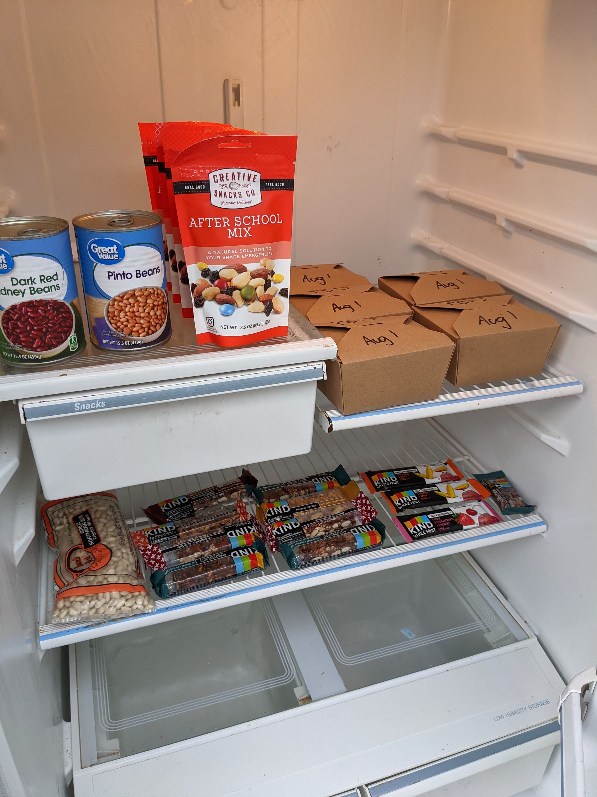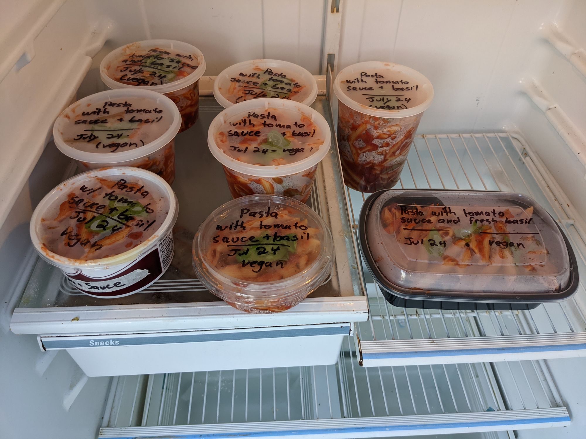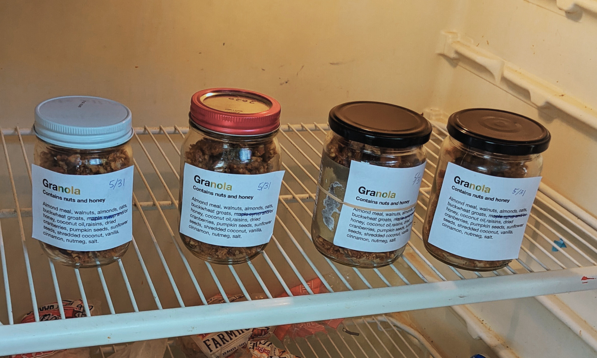 This one is the most involved – though there are simpler granola recipes out there. I make a variation of Angela Liddon's favorite granola recipe, and make sure to apply printed labels since it's full of potential allergens. While involved and a bit more expensive with all those almonds, I've received compliments from hungry folks waiting at the fridges who say it's the best granola they've ever had.